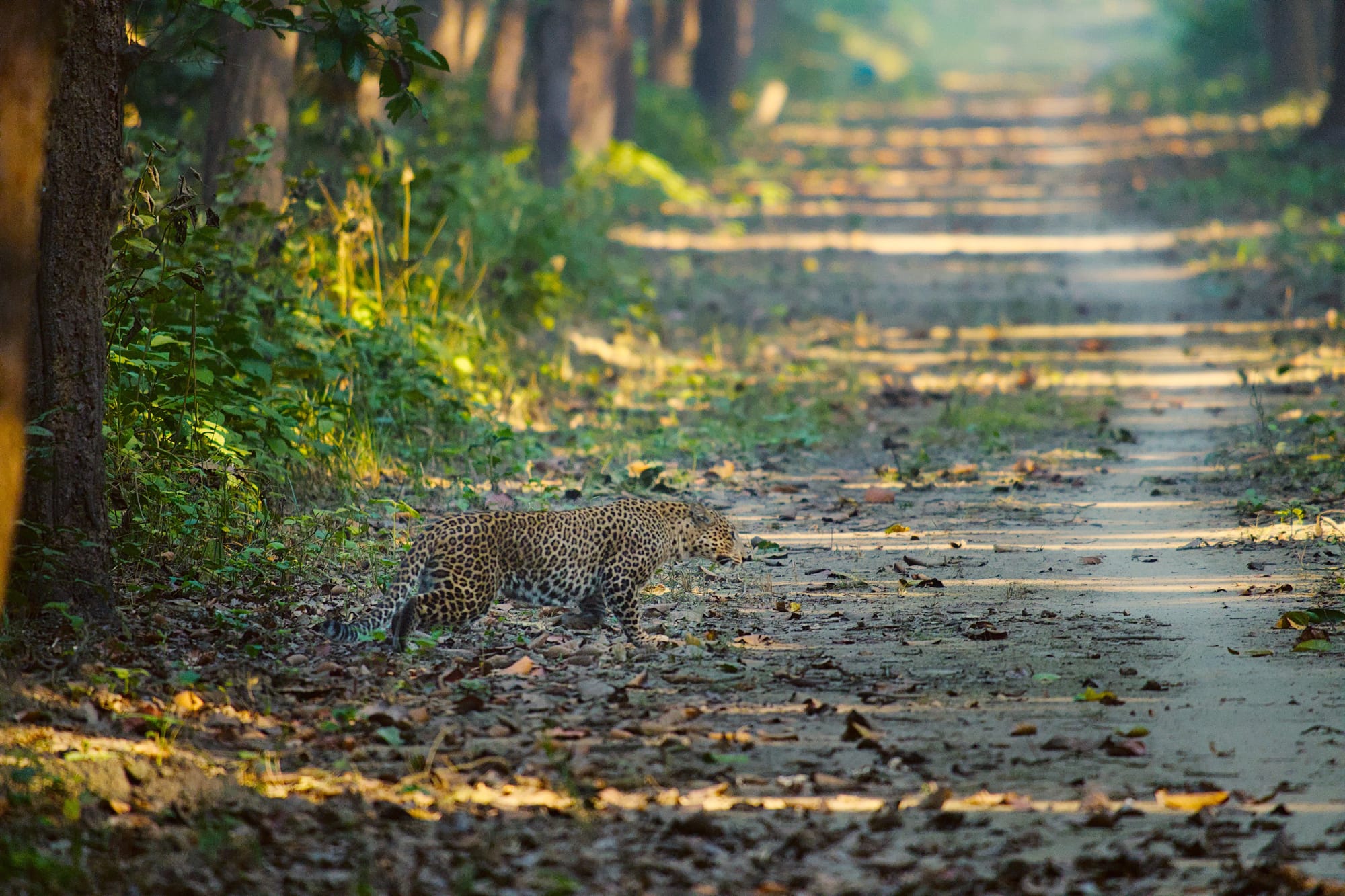 Leopards are hard to spot and photograph. They move about quickly and quietly in the thickets, preferring not to be seen. I was in the Terai forests, near the India-Nepal border, in peak winter. Morning drives in the forest very beautiful with thick fog and dreamy landscapes. But it is not possible to see any wildlife. On one afternoon I saw this leopard cross a trail for only a couple seconds.